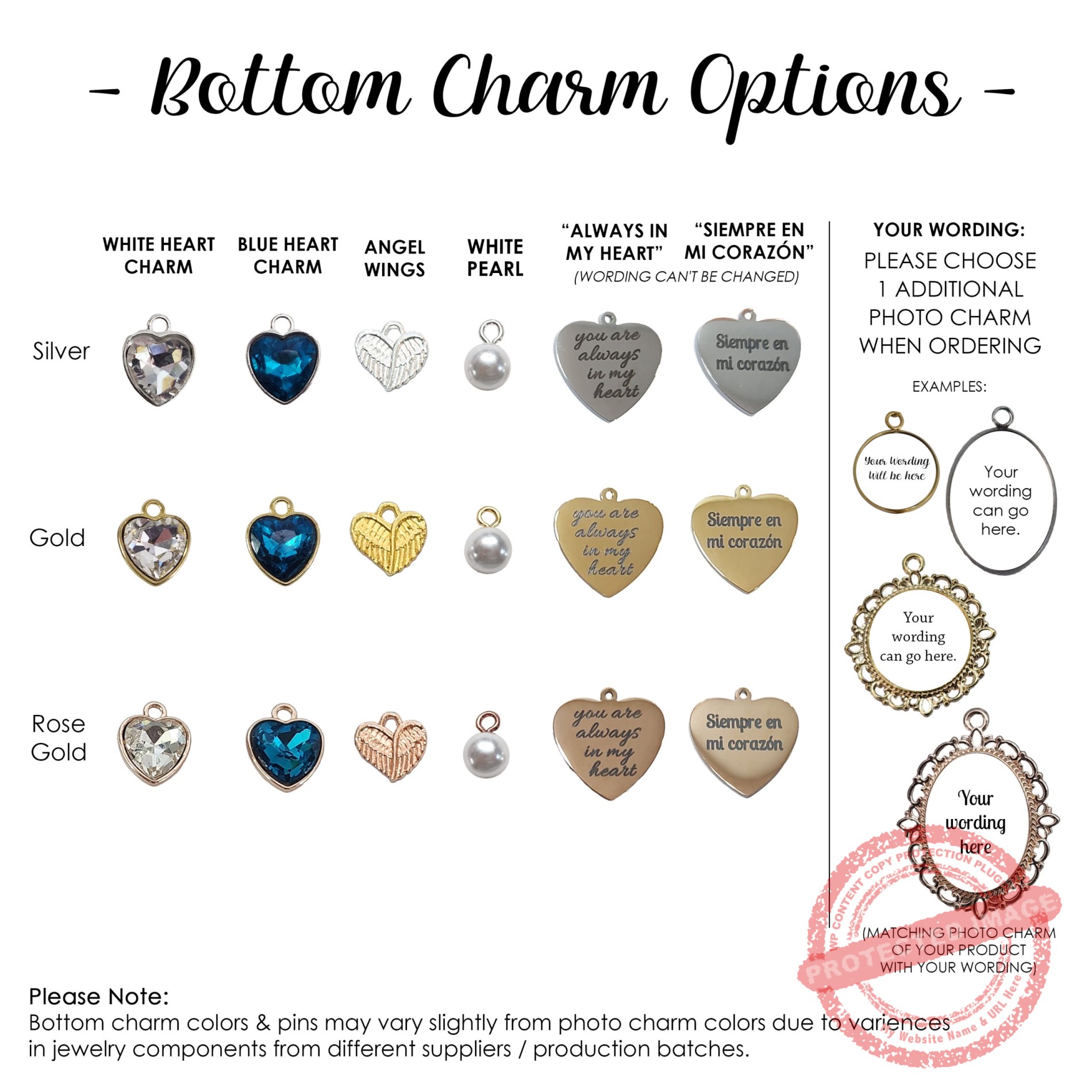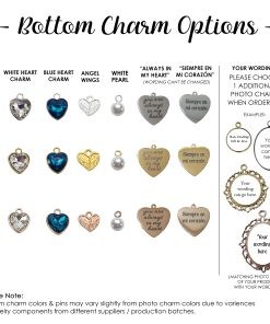 Your Bride Bouquet Charm can feature a beautiful charm at the bottom (optional). Choose from: “You are always in my heart” heart shaped charm (wording can’t be changed), a delicate White Heart, a serene Blue Heart for your “Something Blue”, angel wings, white pearl or opt for No Charm at the bottom.
